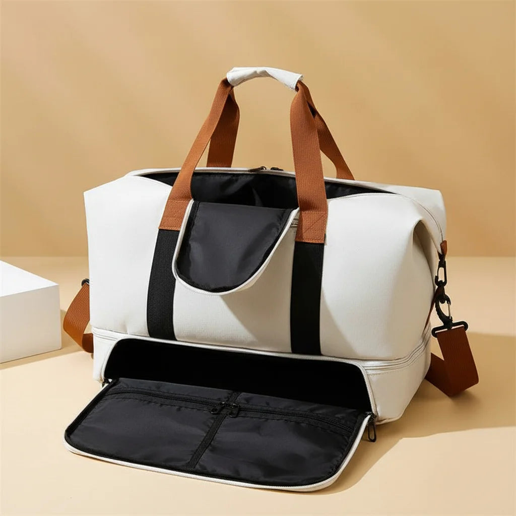 The bag includes a dedicated, separate compartment designed to keep shoes or damp items isolated from the main storage area. This helps keep your belongings organised and maintains a clean interior for everyday essentials.