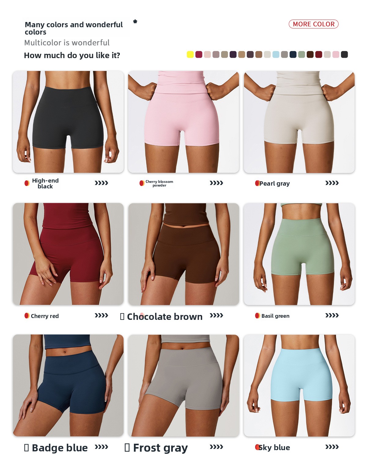 Design: Tight-fit, high-waisted, hip-lifting shorts.