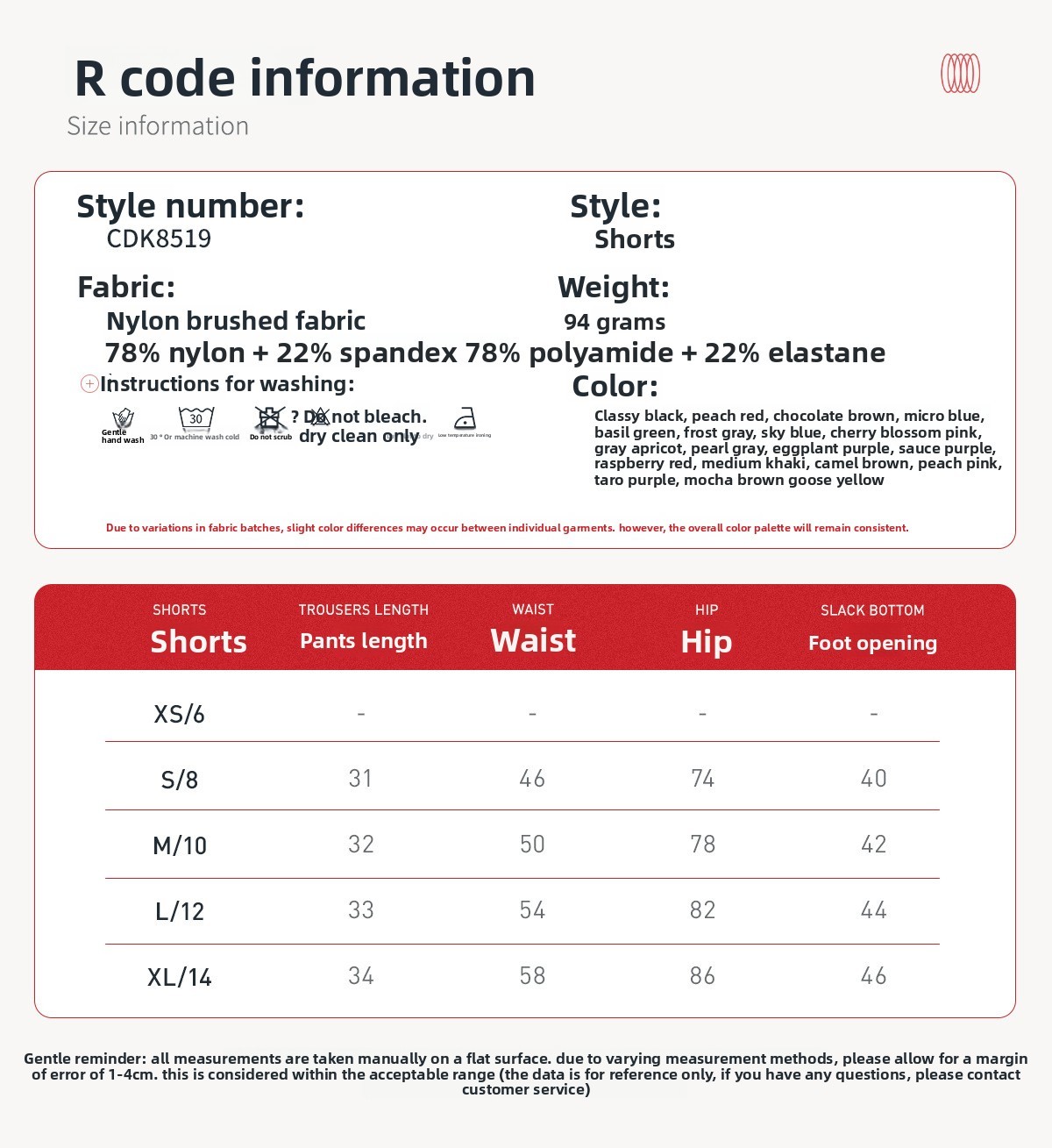 Material: 78% nylon, 22% spandex (brushed fabric).